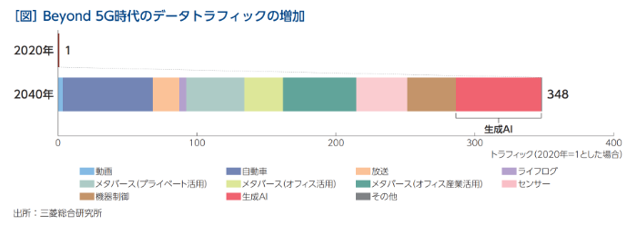 また、三菱総合研究所の予測によると、2030年代にはテクノロジーの発展や少子化の影響により、あらゆる産業や個人へのAIサービスの提供が予測されています。その結果、情報爆発により2040年のデータ流通量は2020年の348倍にもなると試算されています。