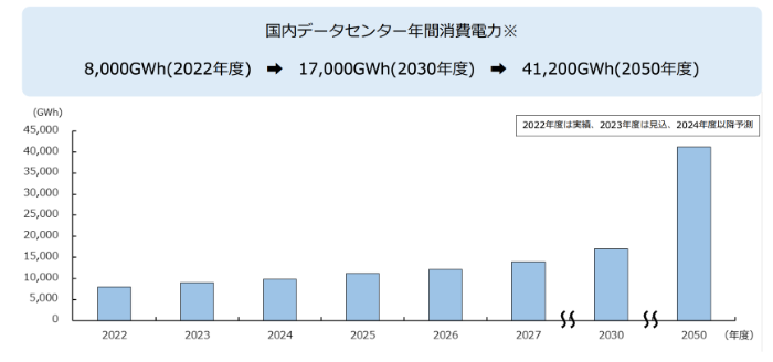 また、2024年に発表された株式会社富士キメラ総研の調査によると、2022年度に約8,000GWhだった国内データセンターにおける年間消費電力は、2030年度には約17,000GWh、2050年度には41,200GWhにまで達する見通しです。そのため、施設全体の受電容量を大幅に強化する必要があります。