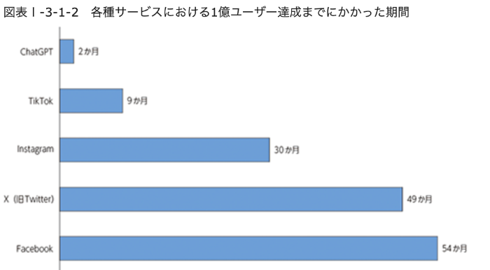 例えば、生成AIの代表ともいえる「ChatGPT」はサービス公開からわずか2か月ほどで1億ユーザーを獲得しています。これは、X(旧Twitter)やInstagramなど既存のオンラインサービスと比較しても異例の速さといえます。