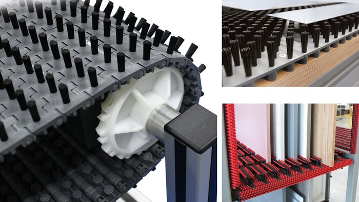 一方、ベルトシステムブラシなどに代表されるブラシを用いた搬送なら、ブラシの毛の隙間から小さなゴミが自然に排出されるため、製品への擦り傷を防止できます。さらに、ワークに付着したゴミをブラシでクリーニングすることも可能です。ブラシとマテハン機器の組み合わせは、安全性や効率性だけでなく製品の品質維持にも貢献します。