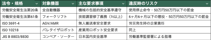 人と共存する環境では、ISO 3691-4(無人搬送車の安全)等の国際規格に沿った安全対策が不可欠です。