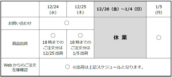 ご注文もいただけますが、納期回答、出荷等は2026年1月5日(月)以降の手配となりますので、ご注意ください。