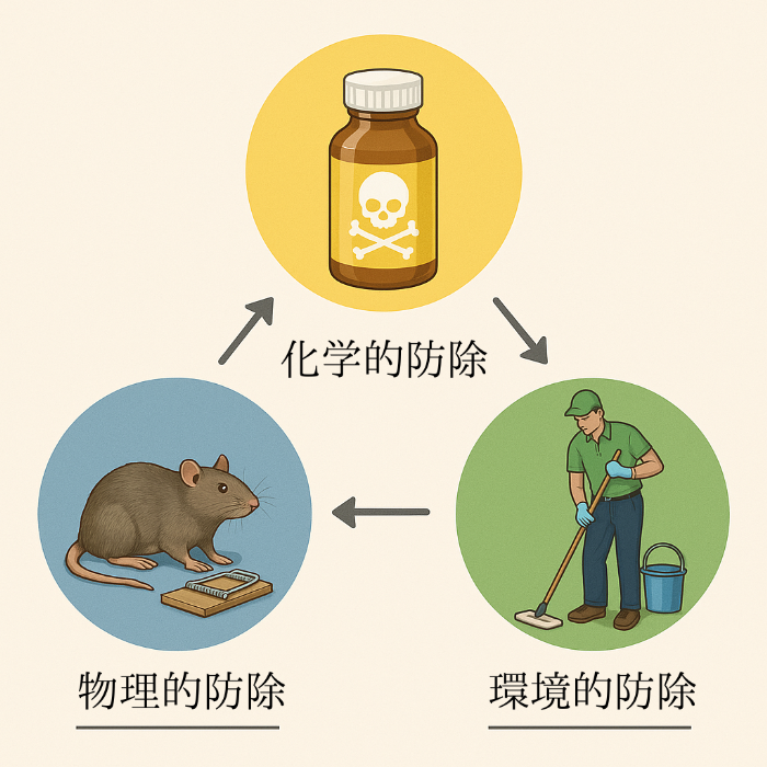 食品工場でネズミを効果的に防除するには、物理的防除・化学的防除・環境的防除の3つの方法をバランス良く組み合わせて実施することが重要です。それぞれの対策は役割が異なるため、特徴を理解して状況に応じた使い分けがより効果を高めます。