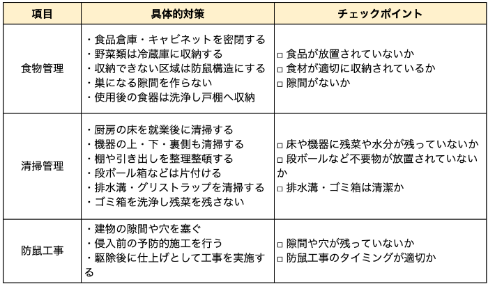 基本的に施設全体で3S(整理・整頓・清掃)を意識し、食材や食品の残滓などネズミの餌になるものは速やかに片付け、清掃をこまめに行うことが大切です。ゴミや段ボールはネズミの隠れ場所になるため、不要なものは放置せずに処分しましょう。
