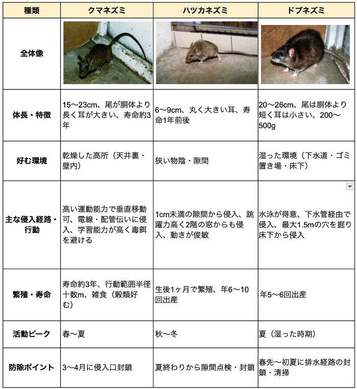 ネズミの侵入対策を検討するうえで、生態を把握しておくことは重要です。ここでは、代表的な3種類のネズミの生態と行動特性について紹介します。
