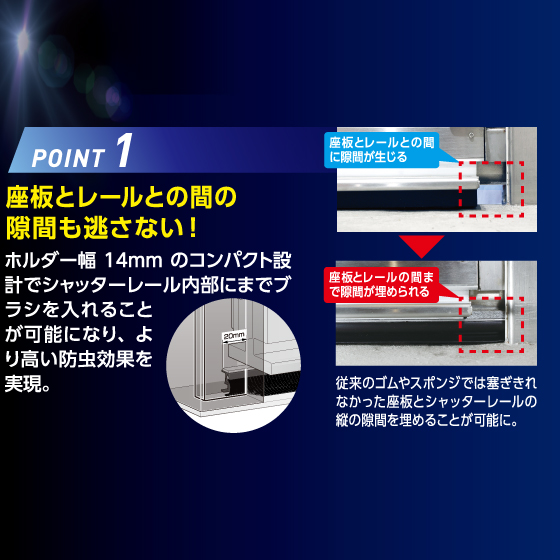 ホルダー幅14㎜のためシャッターレール内部にまでブラシを入れることが可能になり、より高い防虫効果を実現。