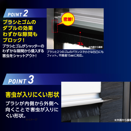 ブラシとゴムがシャッターのわずかな隙間から侵入する害虫をシャットアウト!