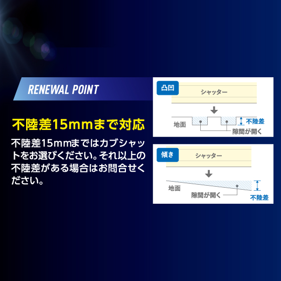 不陸差15mmまではカブシャットをお選びください。それ以上の不陸差がある場合はお問合せください。
