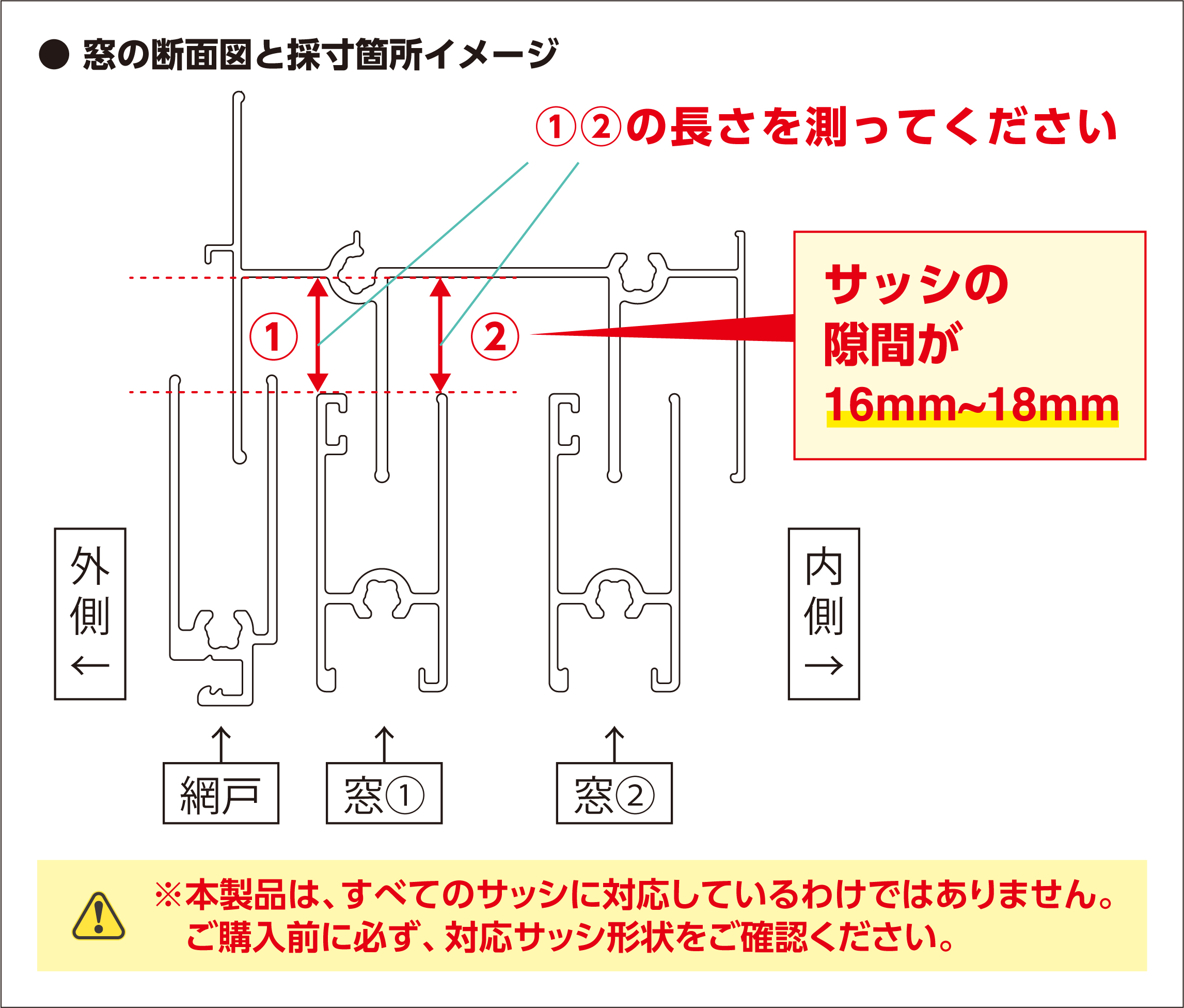 | 注意事項 | 本製品は害虫侵入を軽減するもので、完全に防ぐものではありません。 窓の開閉を妨げない位置に取り付けてください。 高温・火気の近くでは使用しないでください。 長期間使用すると劣化や剥がれが生じる場合があります。定期的に点検・交換してください。 換気が不足しないようにご注意ください。 火災や地震などの緊急時に避難の妨げとならないようご使用ください。 |